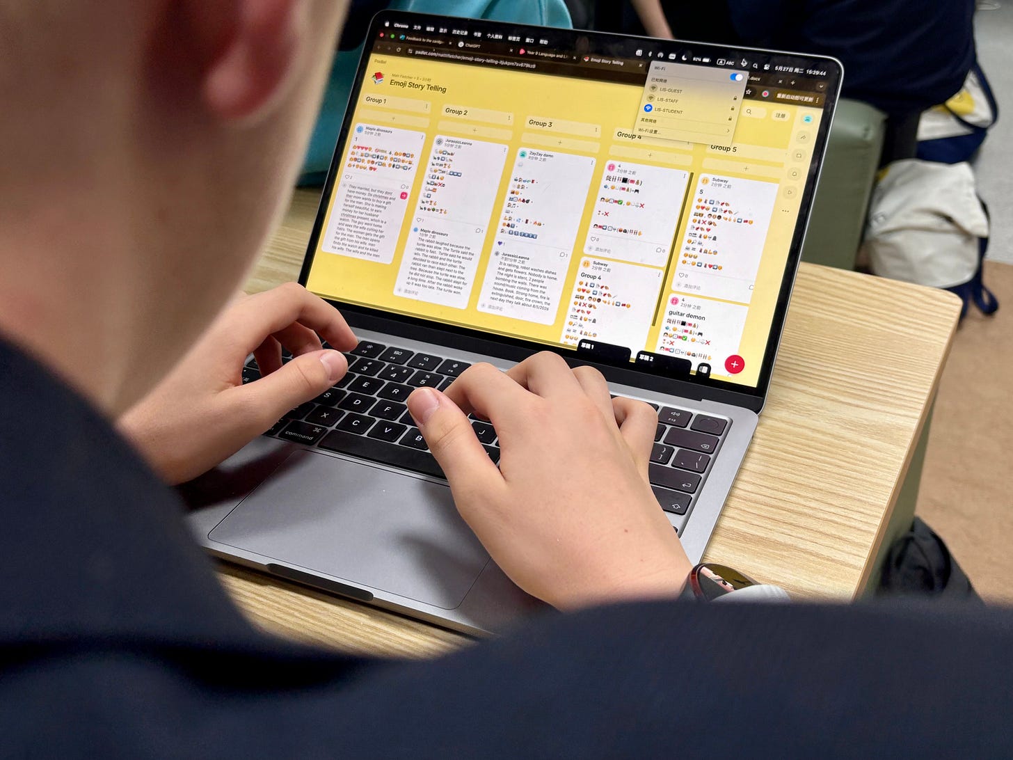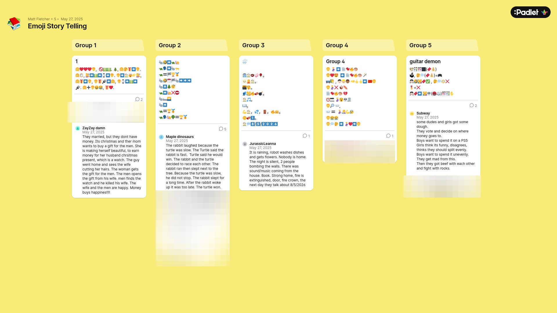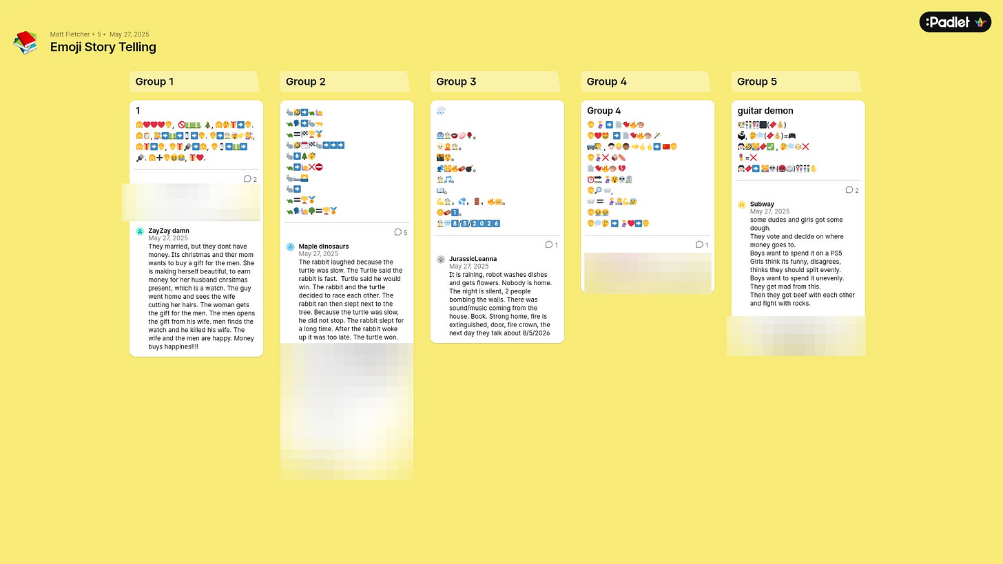 Instead of traditional presentations, we created a class Padlet. Each group posted their emoji story, and students (in groups) were invited to respond to other groups’ emoji sequences by guessing the story and explaining their interpretations. This approach offered multiple advantages: it gave all students a voice (especially those who are shy or still developing language skills), created an instant gallery of peer work, and shifted the focus from performance to interpretation.