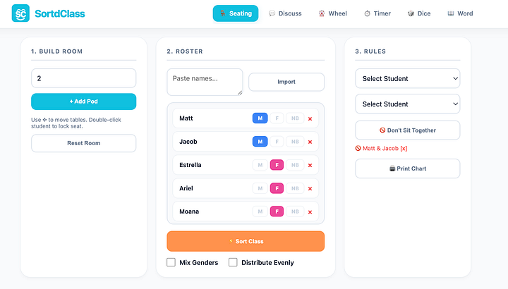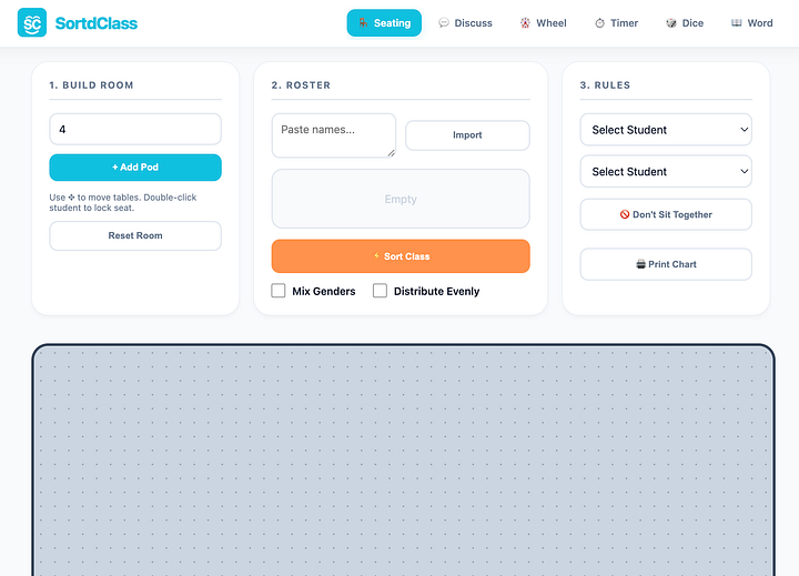 🪑 Smart Seating Charts: This is the flagship feature. You can build your room layout by dragging and dropping “pods” of tables. Import your roster, set specific rules (like “Student A cannot sit with Student B”), and let the algorithm automatically generate the perfect seating plan for you. You can even lock specific students in place before shuffling the rest!