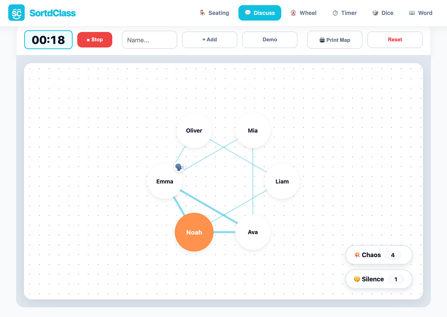 💬 Discussion Mapper: Inspired by the brilliant work of Alexis Wiggins on Spiderweb Discussions, this tool visualizes your classroom dialogue. It creates a map of your students where you can click to track who is speaking, record when the discussion is getting out of hand(Chaos), and moments of silence. It draws lines between speakers to show the flow of conversation—perfect for giving students concrete data on their listening and communication skills.