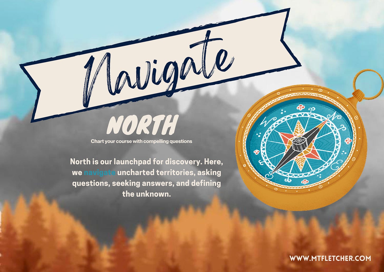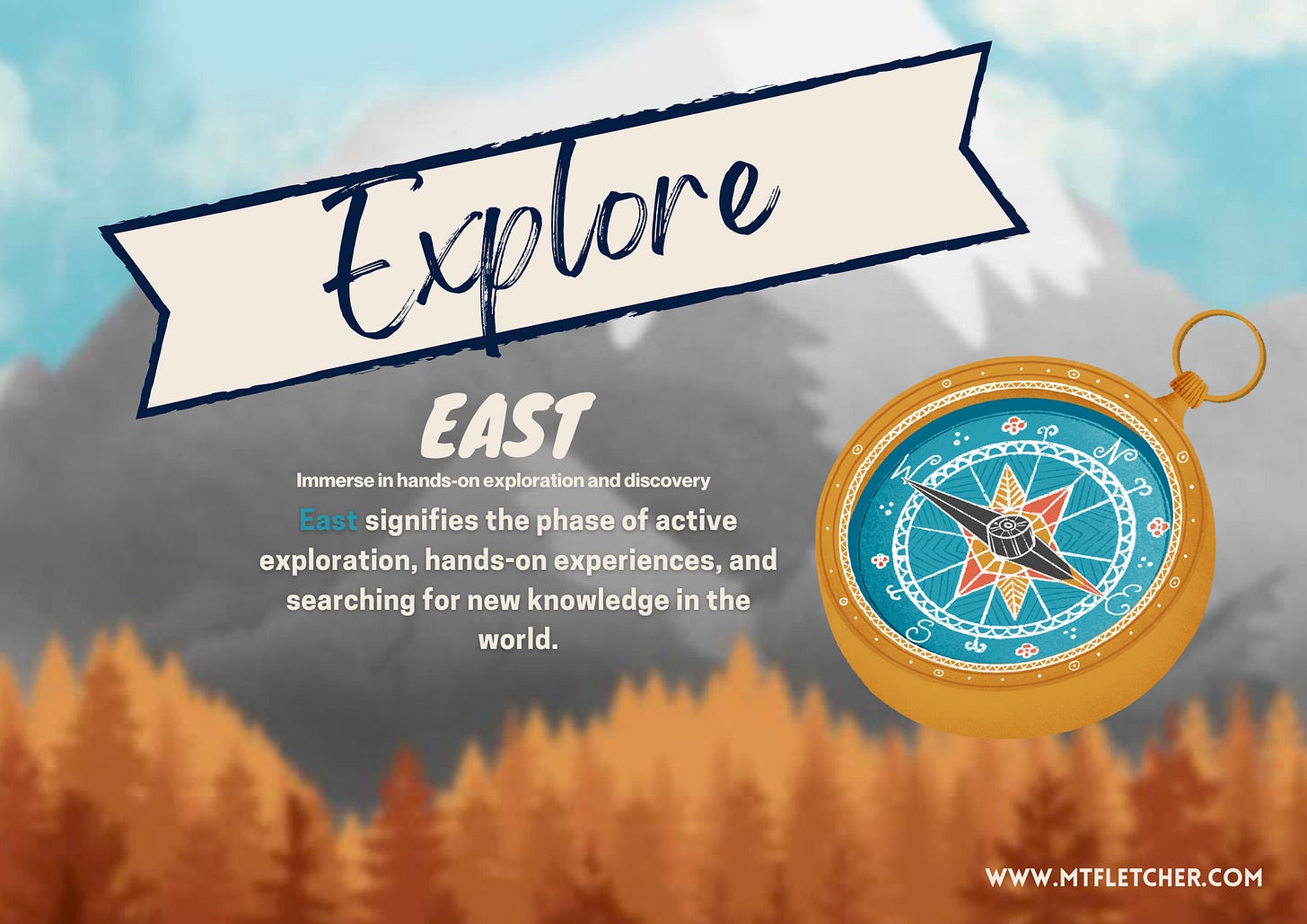 The Free Inquiry Project is structured around a four-stage framework I developed: Expedition into Inquiry. Each stage aligns with a direction — a metaphorical compass to guide the process. Although the following outlines the project to be used for an English literature class, the content can totally be changed for any subject.